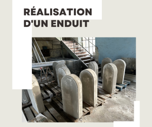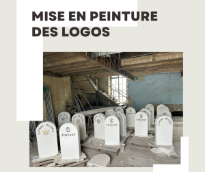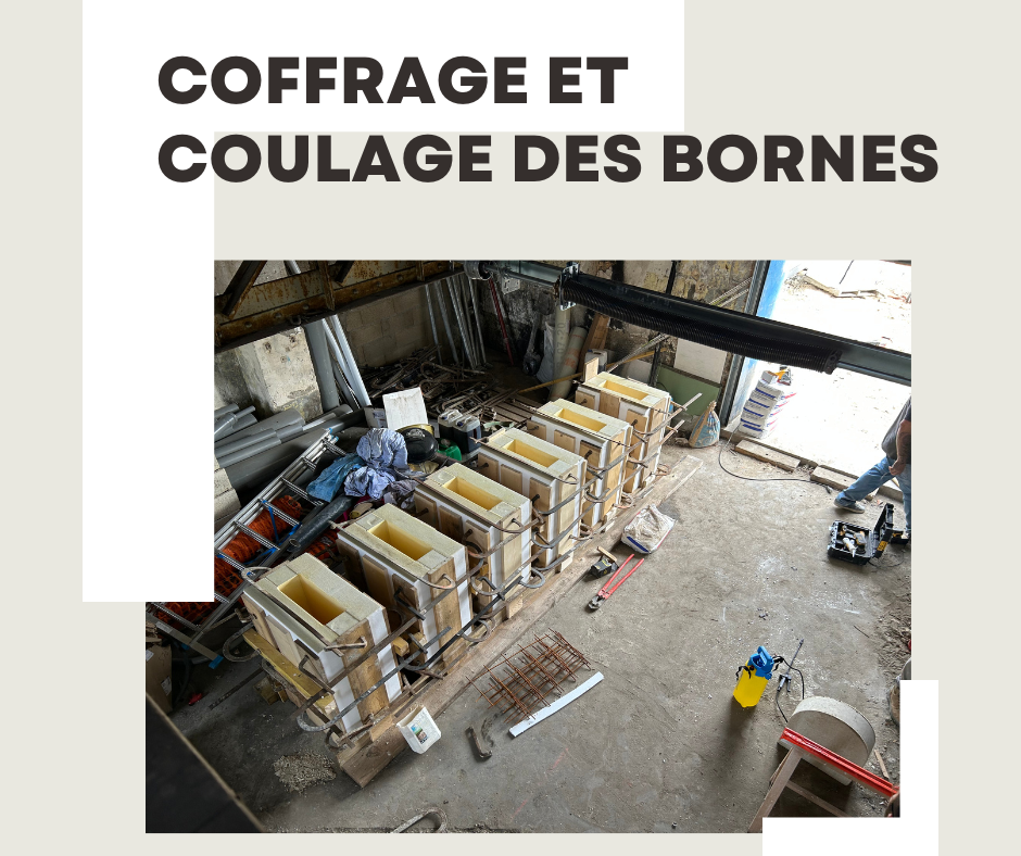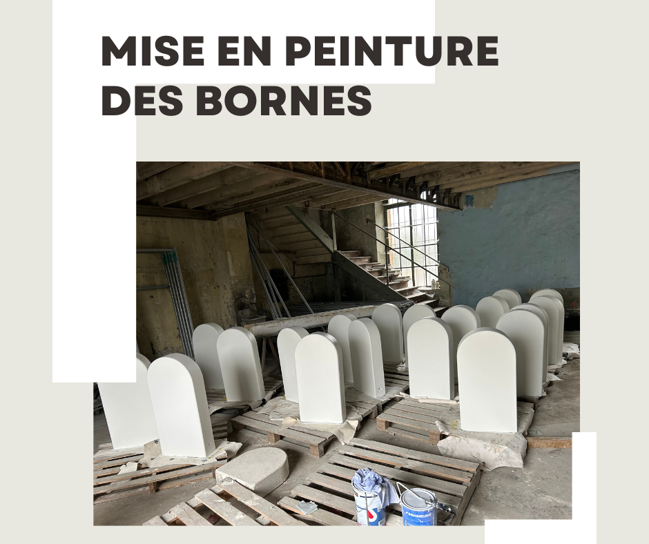Réalisation des bornes en béton blanc dans des moules en polystyrène, réalisation d'un ragréage et mise en peinture de couleur blanche argentine et mise en place de pochoir pour le logo.