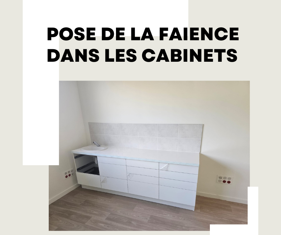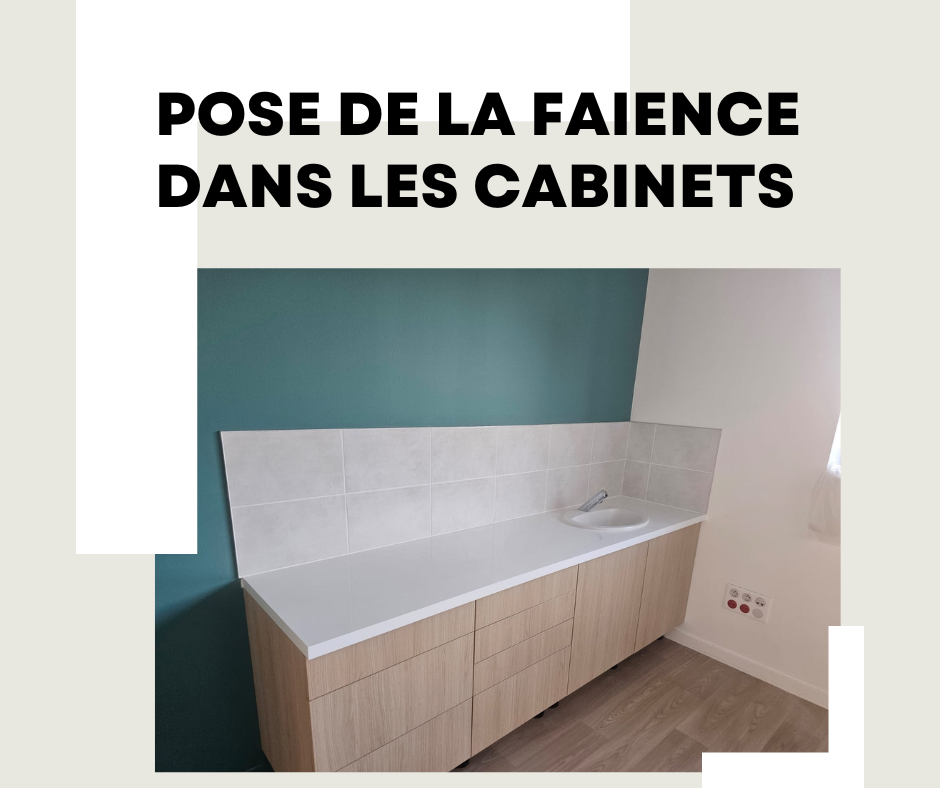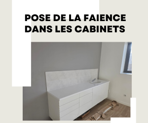 Pose de la faïence au-dessus des plans de travail suite à la création des cabinets au premier étage.