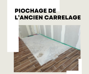 Démolition des anciens carrelages, pose d'un nouveau carrelage 20 x 120 imitation parquet.